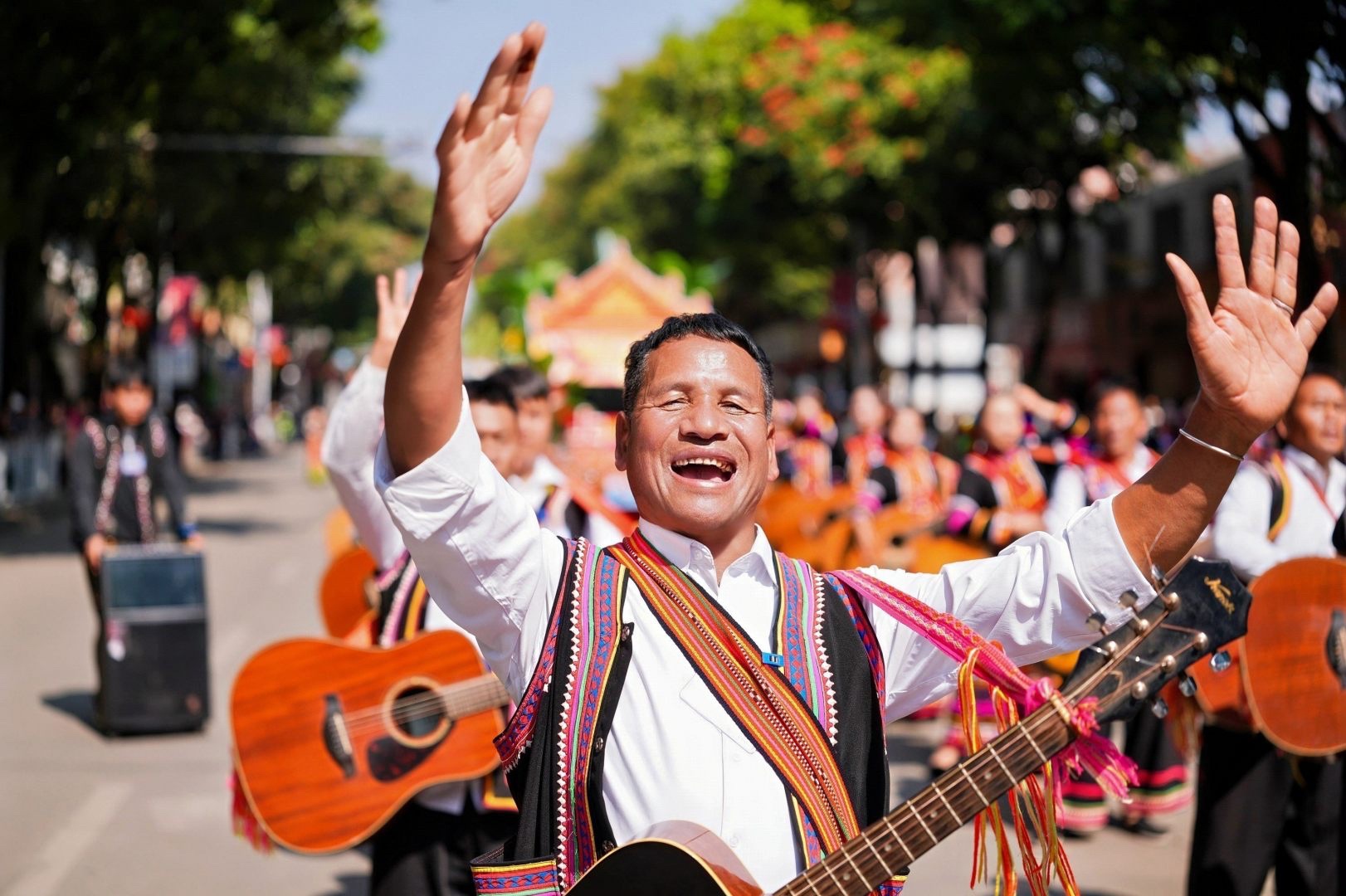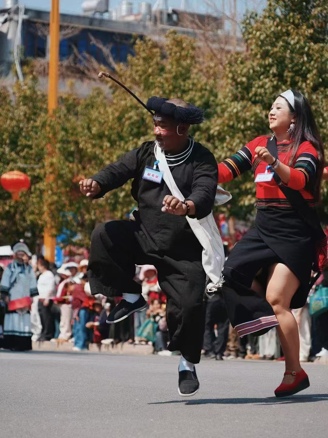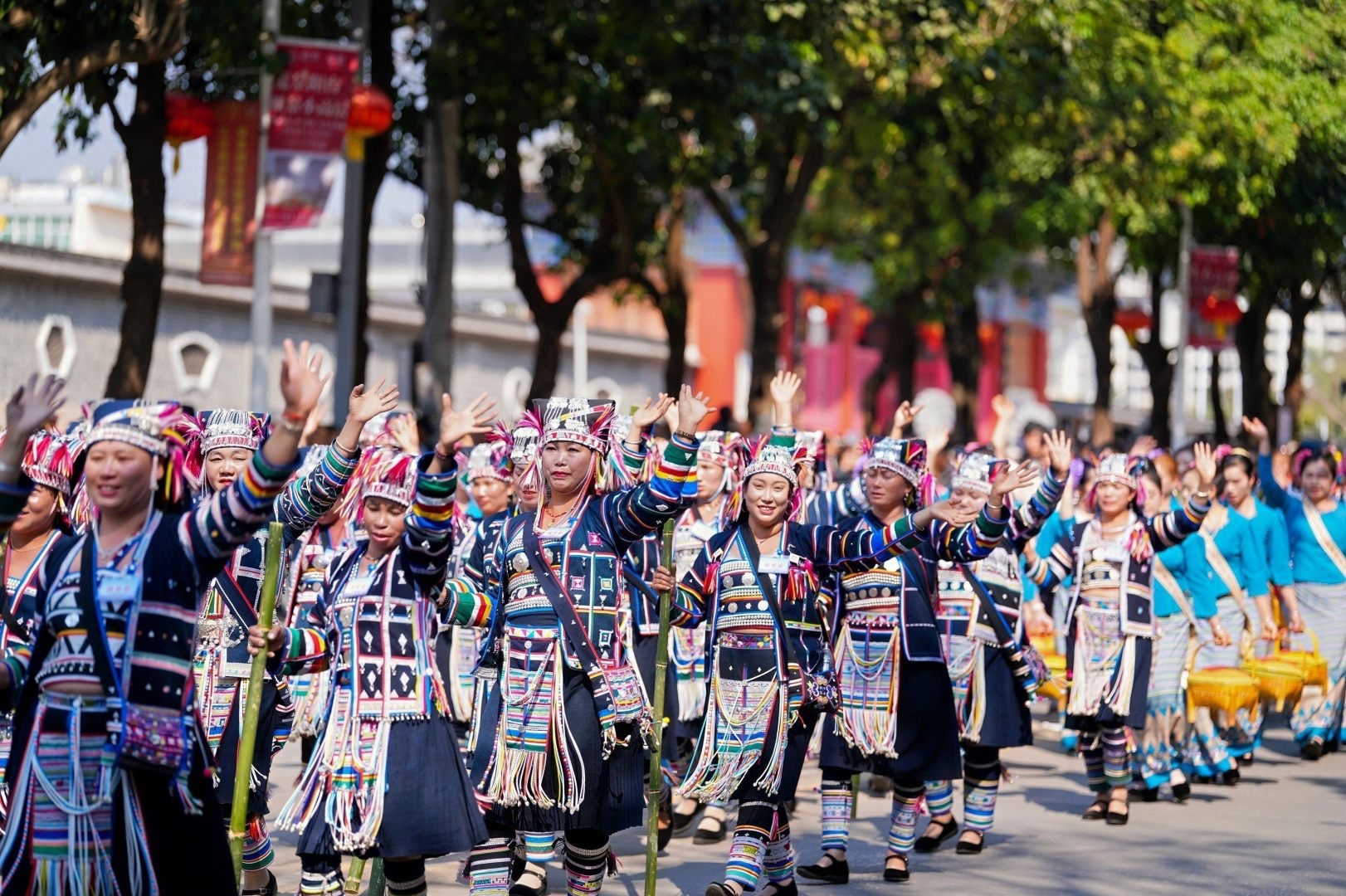 这种“热辣滚烫”的节日氛围,不仅源于精彩的表演,更源于刻在拉祜族人骨子里的热情。在澜沧,有一句俗语:“会说话就会唱歌,会走路就会跳舞。”巡游途中,不仅有精心编排的方阵表演,更有自发的群众狂欢。在此起彼伏的歌声中,游客们不再是旁观者,而是被热情地拉入队伍中,笨拙却快乐地学着跳起芦笙舞。这一刻,地域的界限被打破,民族的差异被消融,人们手拉手、肩并肩,在欢歌笑语中像石榴籽一样紧紧抱在一起。