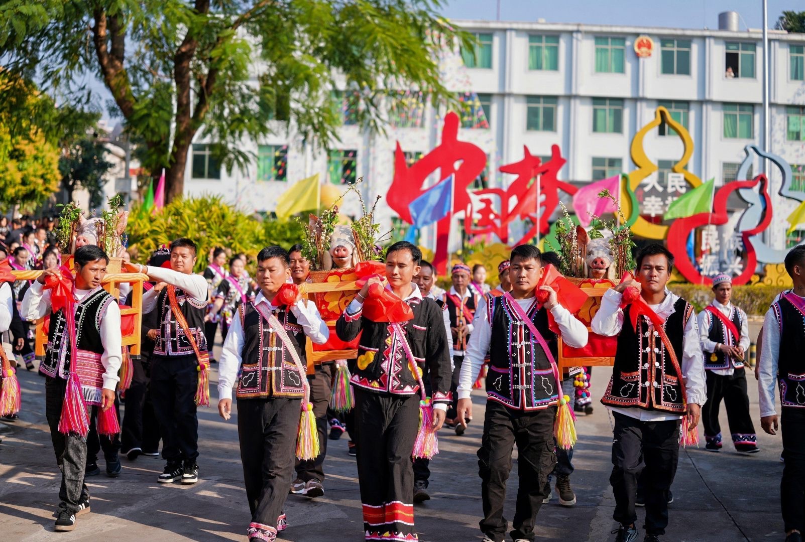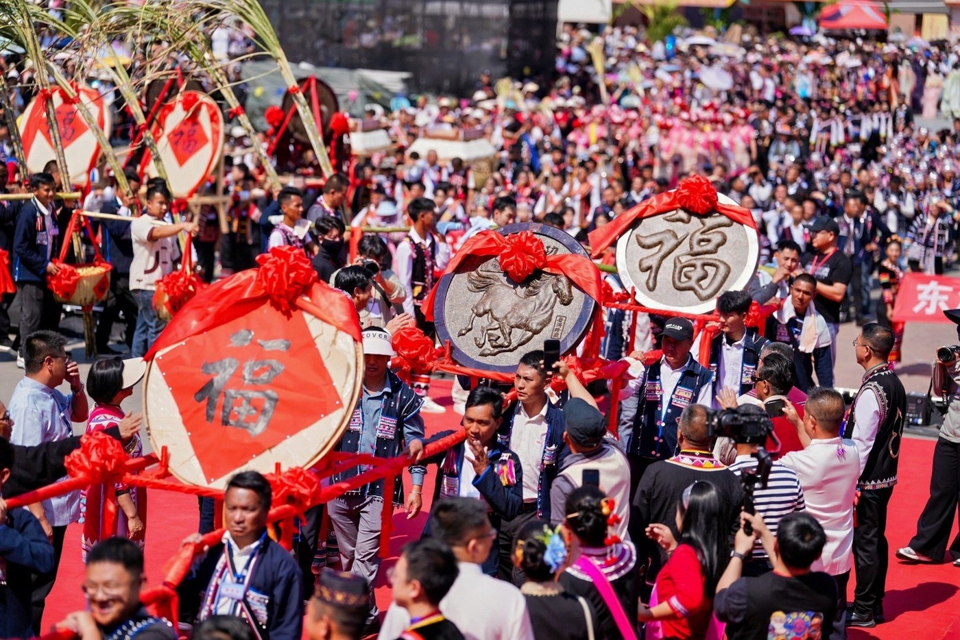 上午,随着几声浑厚的礼炮划破长空,巡游队伍浩浩荡荡地走上街头。最引人注目的是极具拉祜特色的“拜年团”。他们有的肩扛甘蔗,寓意新的一年生活“节节甜”;有的手捧大如簸箕的糯米粑粑,象征团圆与富足;还有的背着金黄的蜂蜡和自家酿制的醇酒,向沿途的观众致以最质朴的节日祝福。