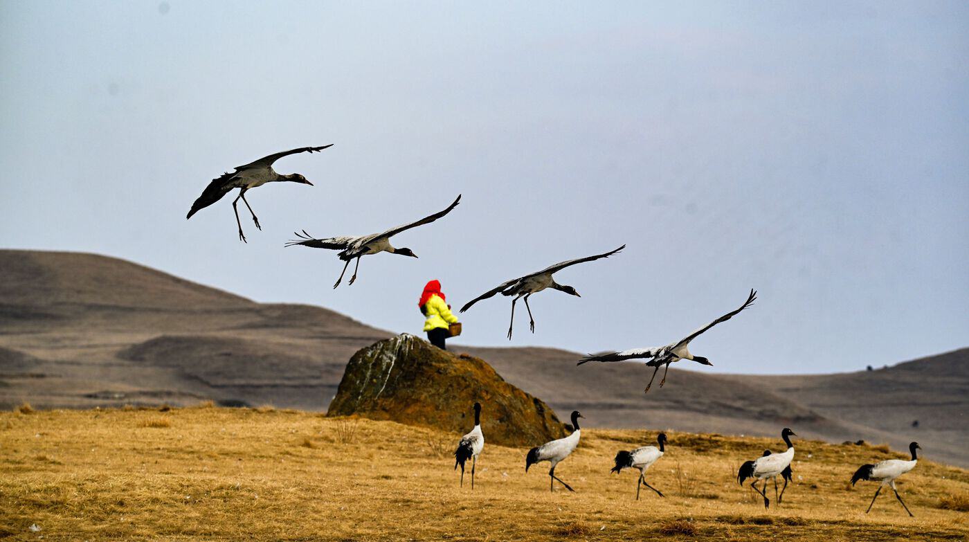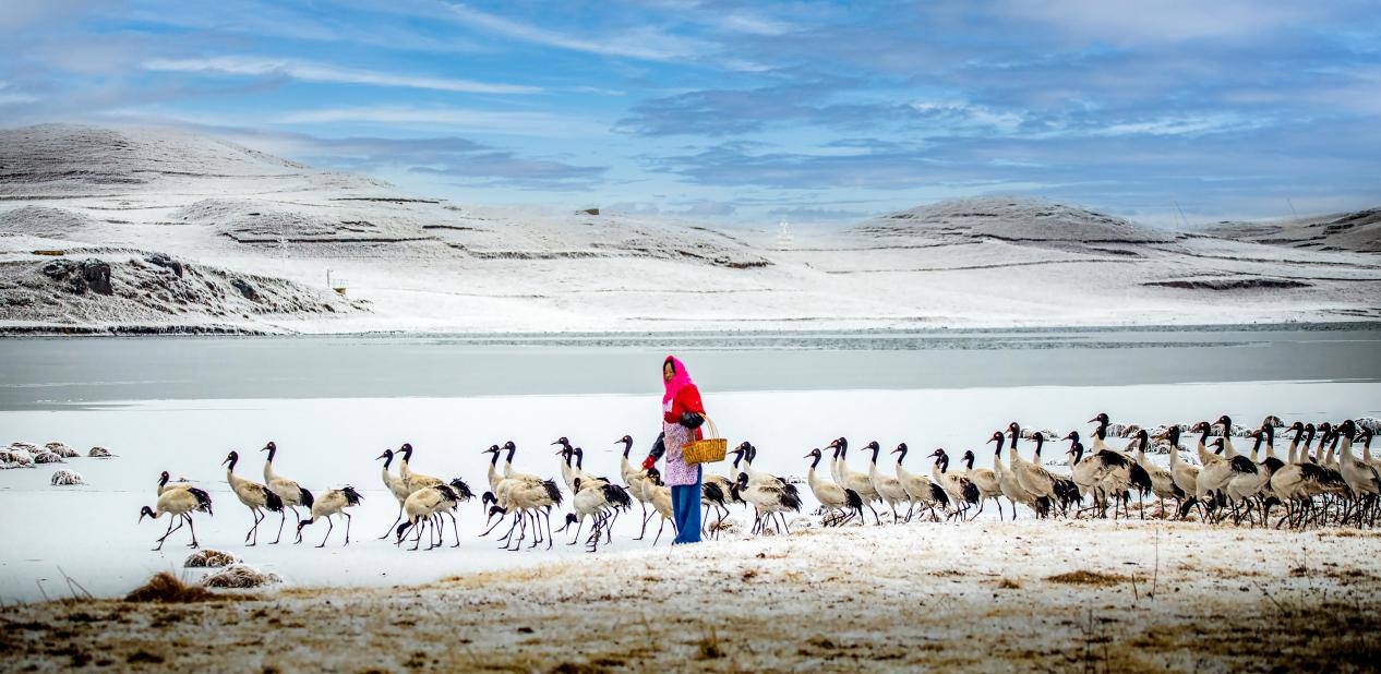 “黑颈鹤机警,怕人。刚开始补充食物时,它们只敢远远看着。”如何取得这些精灵的信任?她尝试过各种办法,日复一日,哨声建立起了人与鹤之间无需言语的默契。如今,陈光惠年轻的儿子也加入了护鹤队伍,从婆婆、母亲到儿子,一场跨越三十余年的守护接力仍在继续。