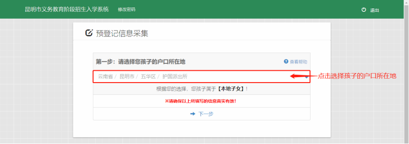 根据系统要求逐级选择孩子的户口所在地,系统会根据所选户口判定属于“本地子女”或“随迁子女”,确认无误后点击