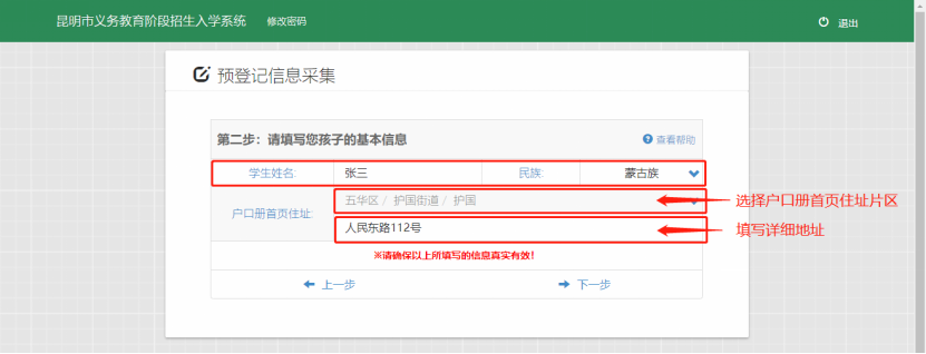 根据系统要求,首先,填写孩子姓名、民族(性别及出生日期为系统自动识别,无须填写);其次,根据户口册首页住址,选择孩子户口所在区、街道及社区并填写完善详细地址。如下图: