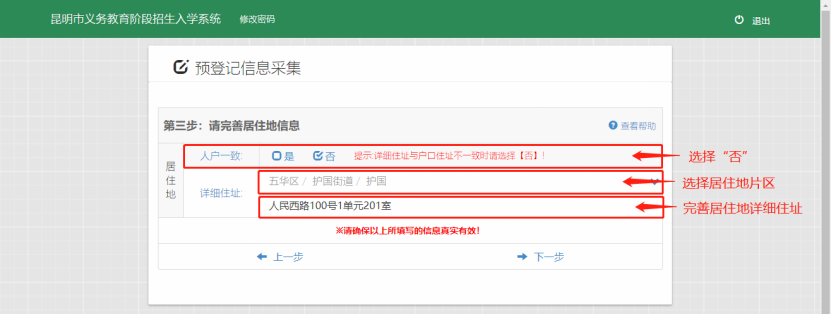 注意:居住地所属县区和居住证(或主城户籍)签发机关所属县区应该一致。(如:居住证签发机关或父母一方户口所属五华区,那么在选择居住地片区时就只能选择五华区辖区内的街道和社区)。
