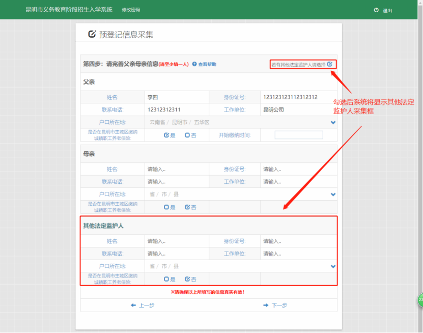 根据系统要求填写家长信息,要求至少填写一人。如下图: