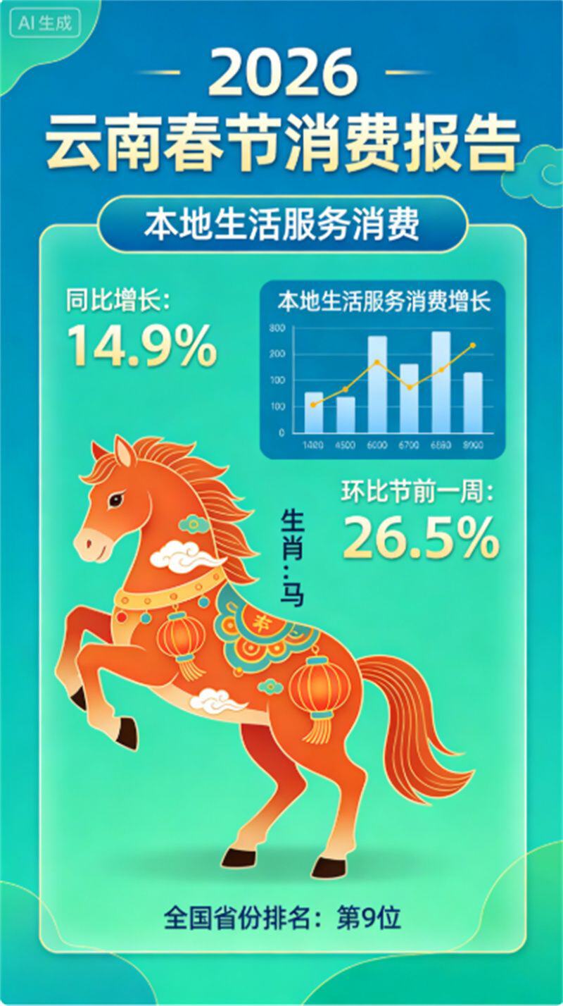 2026年春节假期,云南本地生活服务消费市场迎来强劲增长,消费活力全面释放,展现出文旅融合发展的良好态势。据美团本地生活服务最新数据显示,春节假期云南省本地生活服务消费同比增长14.9%,较节前一周环比增长26.5%,在全国省份中位列第9。