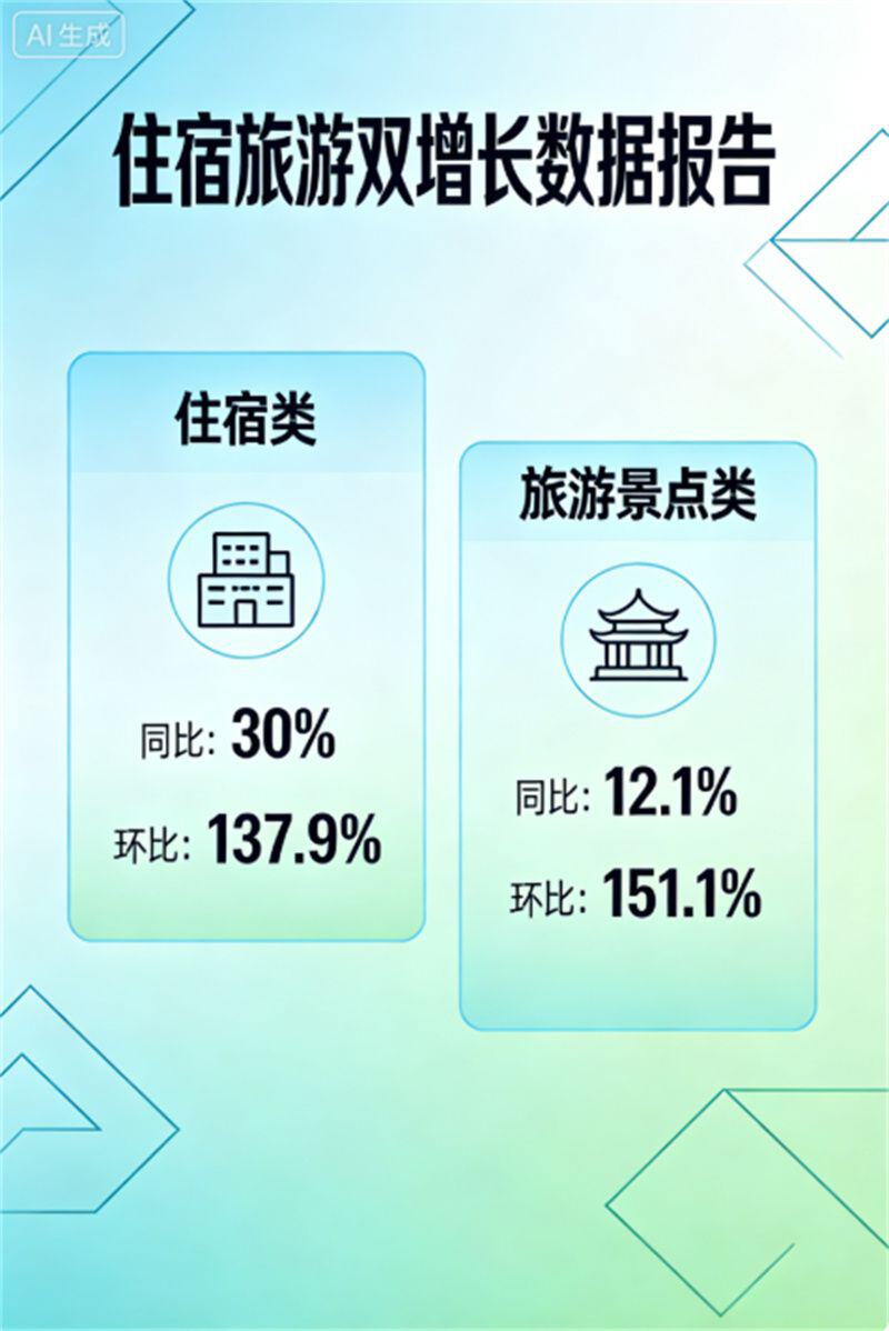 从主要消费场景来看,住宿类消费同比增长30%,环比增幅高达137.9%,成为本次假期消费增长的主力军;旅游景点类消费同比增长12.1%,环比增幅达151.1%,显示出节日期间旅游需求的集中释放。
