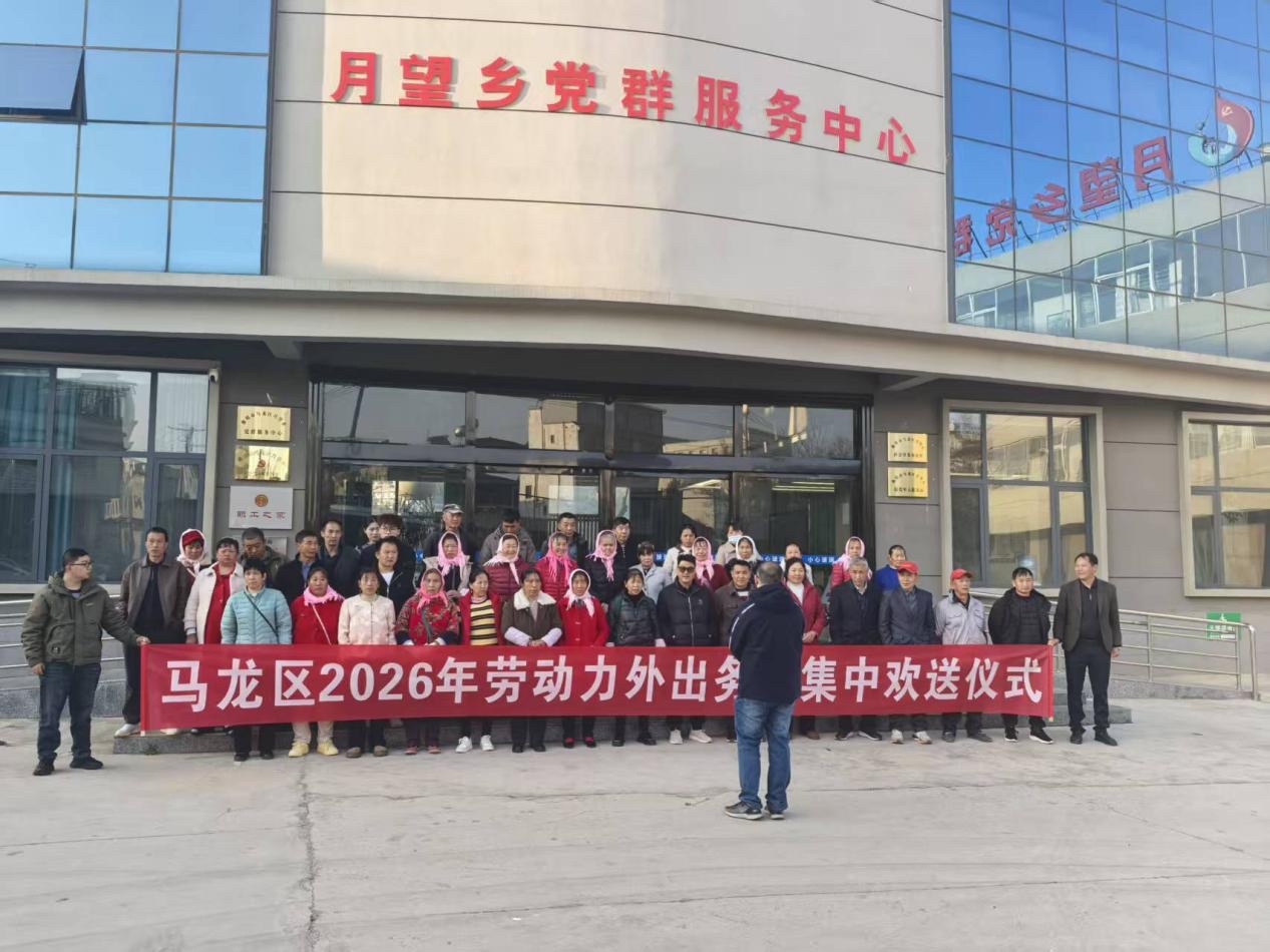 马龙区2026年劳动力外出务工集中欢送仪式在月望乡党群服务中心举行,50余名务工人员开启新一年务工创收征程。现场,区人力资源和社会保障局发放矿泉水、方便面等物资,采取“点对点”大巴车直达运输。