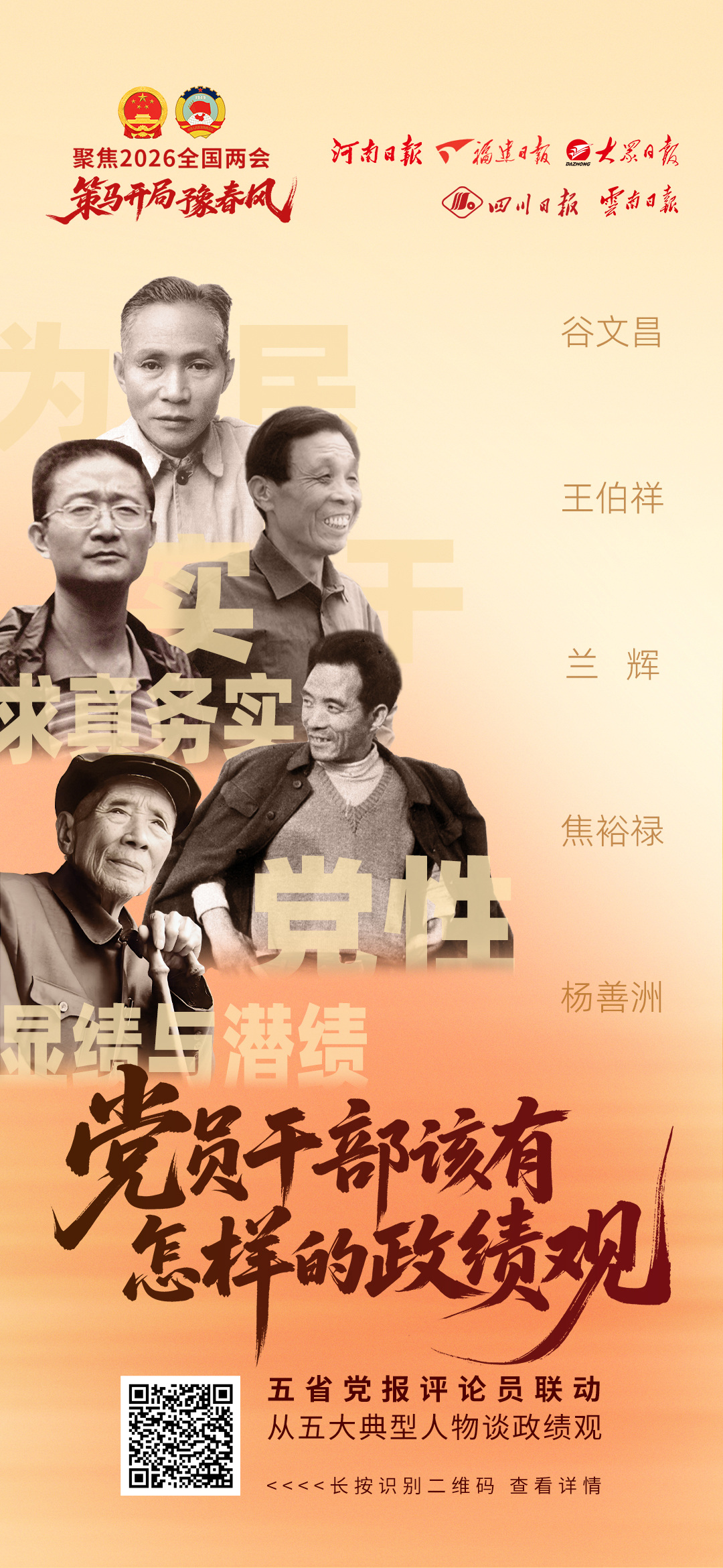 今年是“十五五”开局之年,不少地区和部门正在编制五年规划,一些地方又在陆续换届,当此克难攻坚、闯关夺隘之际,面对推动高质量发展的“时”与“势”,围绕如何回答好“政绩为谁而树?树什么样的政绩?靠什么树政绩?”云南日报联动河南日报、福建日报、大众日报、四川日报,对照焦裕禄、谷文昌、王伯祥、兰辉、杨善洲五位典型人物的政绩观,论述“党员干部该有怎样的政绩观”,敬请垂注。