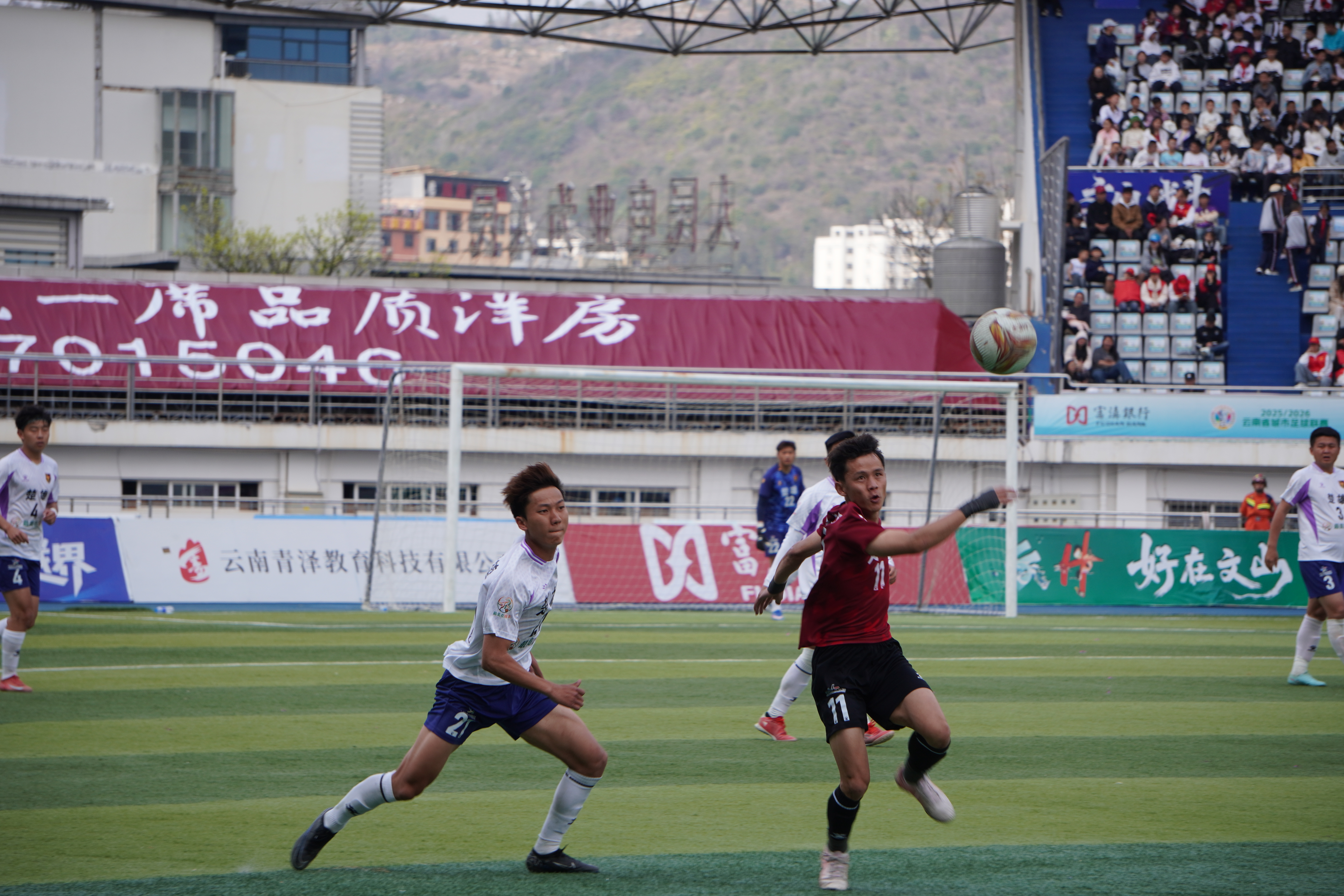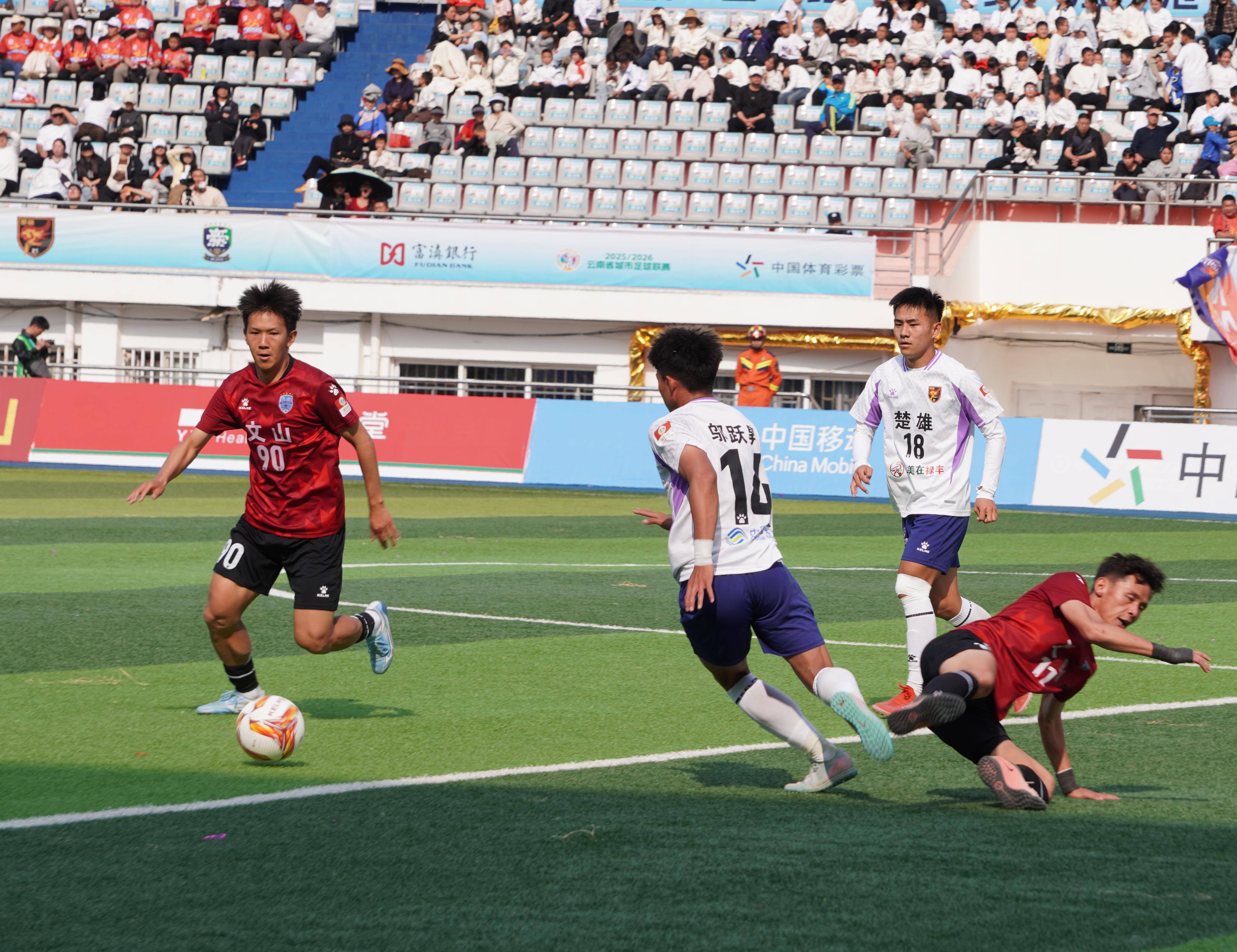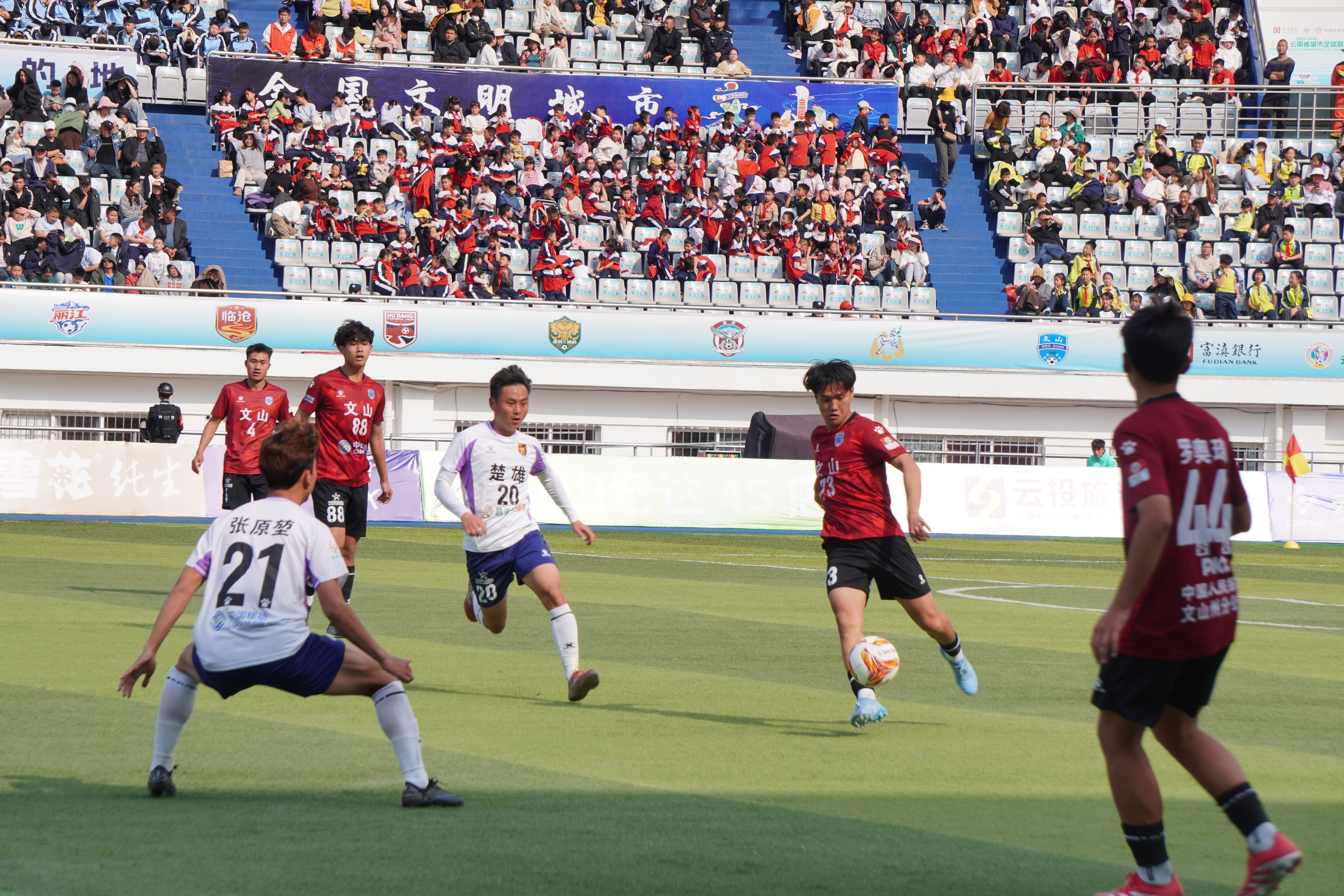 易边再战,文山队明显加大了进攻力度。53分钟左右,场上僵局被打破。文山队获得角球机会,11号球员吴嘉怀攻破楚雄队的球门,场上僵局被打破,比分变为1:0。文山市盘龙体育场瞬间沸腾,欢呼声震天。