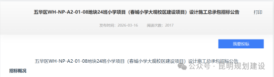 3月16日,云南省公共资源交易信息网发布“五华区WH-NP-A2-01-08地块24班小学项目(春城小学大观校区建设项目)设计施工总承包招标公告”,根据公告,该项目位于五华区大观街道,规划道路以南,大观路以北,西昌路以西区域。