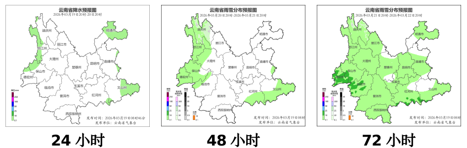 3月20日20时到3月21日20时:迪庆州北部和东部的高海拔地区阴有阵雪,迪庆州西南部、怒江州、丽江市西部、大理州西部、保山市、德宏州、临沧市北部、红河州南部、文山州南部、曲靖市东南部多云有阵雨,其他地区多云间晴。