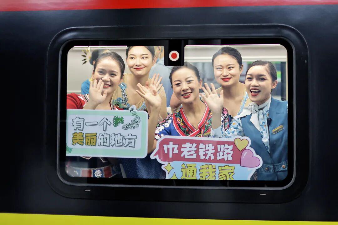 中老铁路通车首日,乘务员举牌庆祝。陈飞 摄
