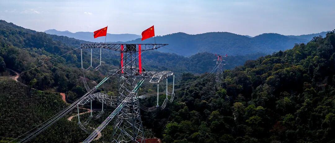 中老500千伏联网工程输电导线在中国云南磨憨镇与老挝琅南塔省交界处实现高空物理联通。高吴双 摄