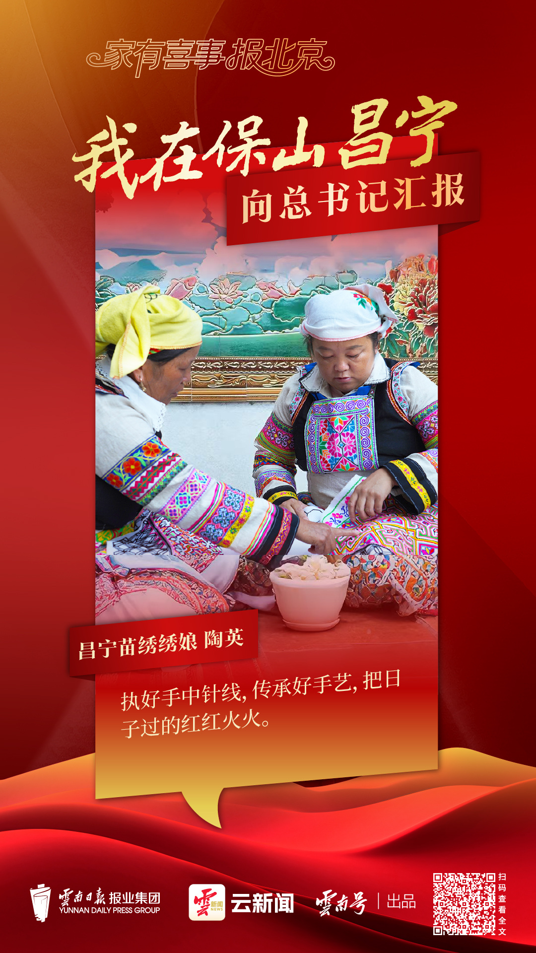 “我们一定传承好这门老手艺,把每一件服饰都绣好,不仅让更多人了解昌宁苗绣,也带动身边更多姐妹一起靠这门手艺增收致富,让苗绣这门技艺,在指尖传递、代代相传。”陶英说。