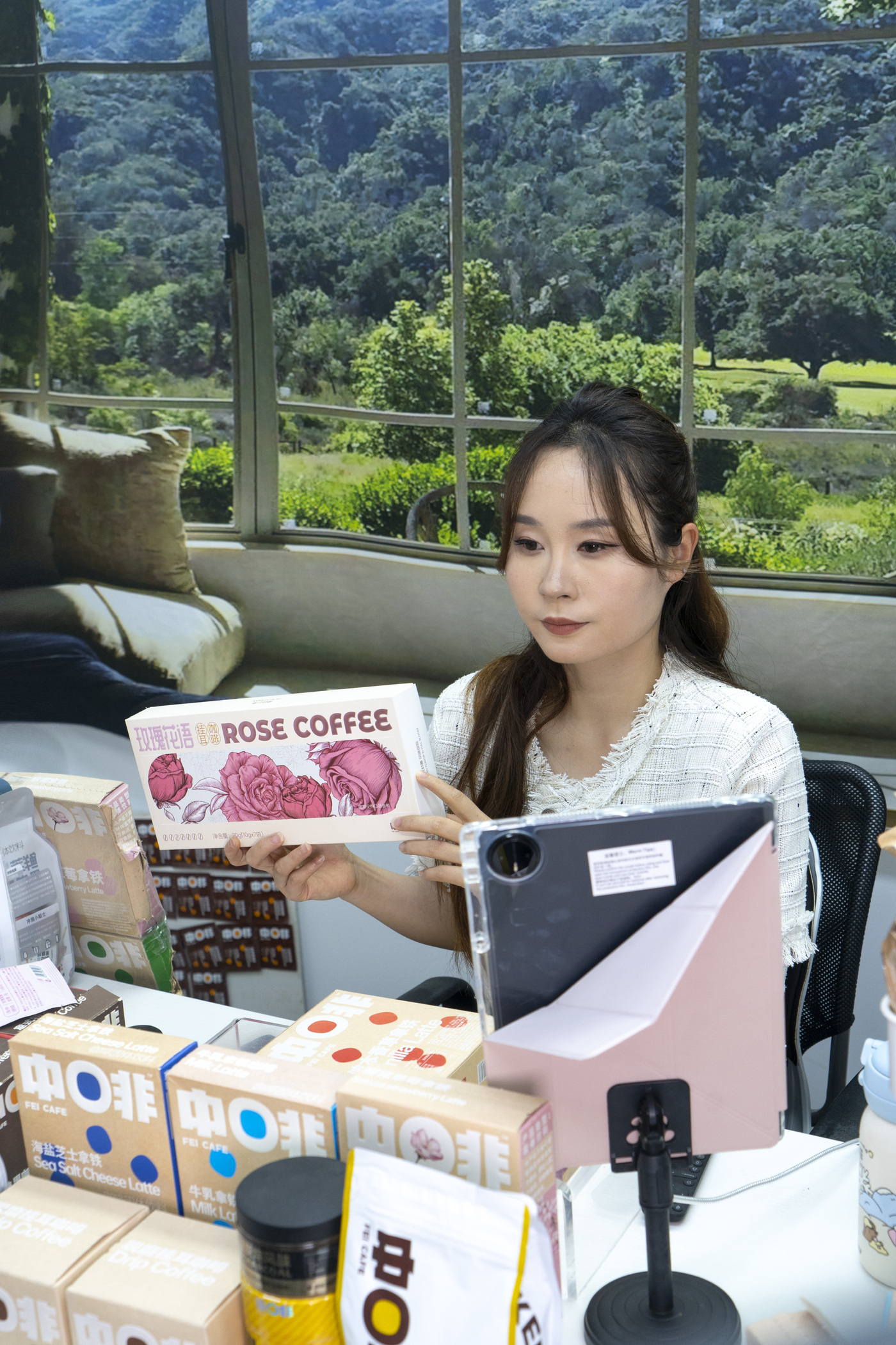 主播胡月在直播间介绍玫瑰花语挂耳咖啡