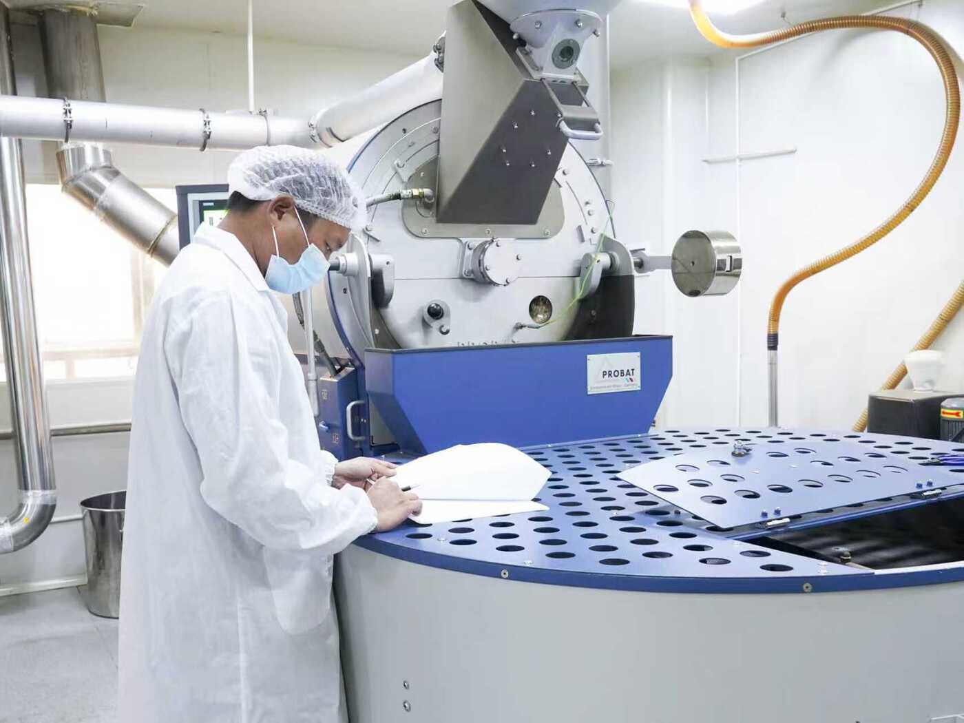 企业技术人员在烘焙咖啡豆、检查设备参数。