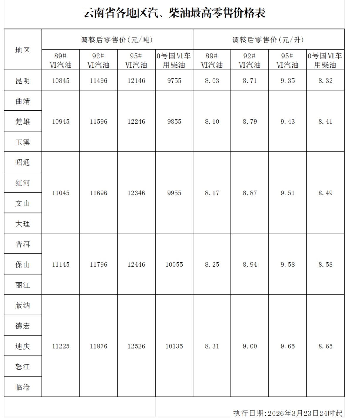记者从省发展改革委获悉,根据国家发展改革委调价消息,云南省自3月23日24时起,调整汽、柴油最高零售价格。