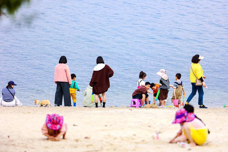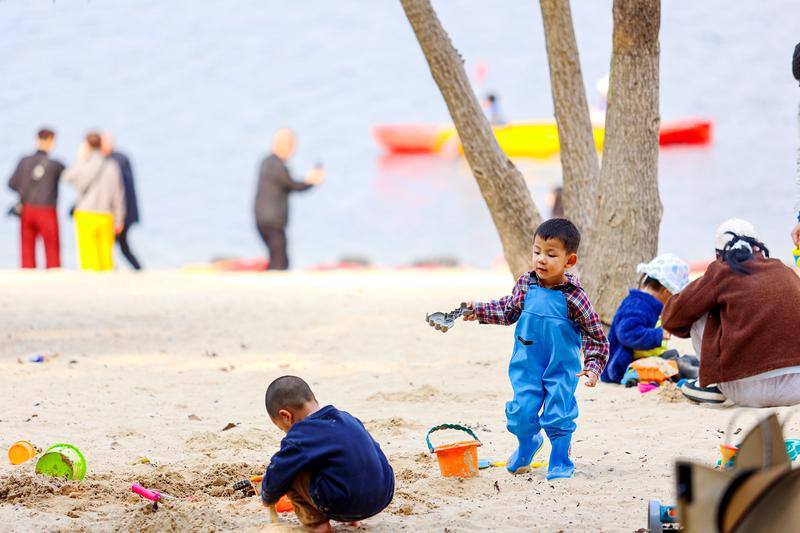 在抚仙湖明星鱼洞风景区,市民游客在沙滩上玩耍。