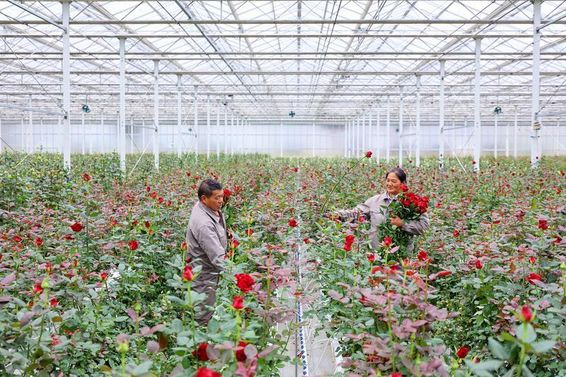 丽江现代花卉产业园2号温室大棚内,工作人员正在大棚内采摘玫瑰花。陈飞 胡妤雅 摄