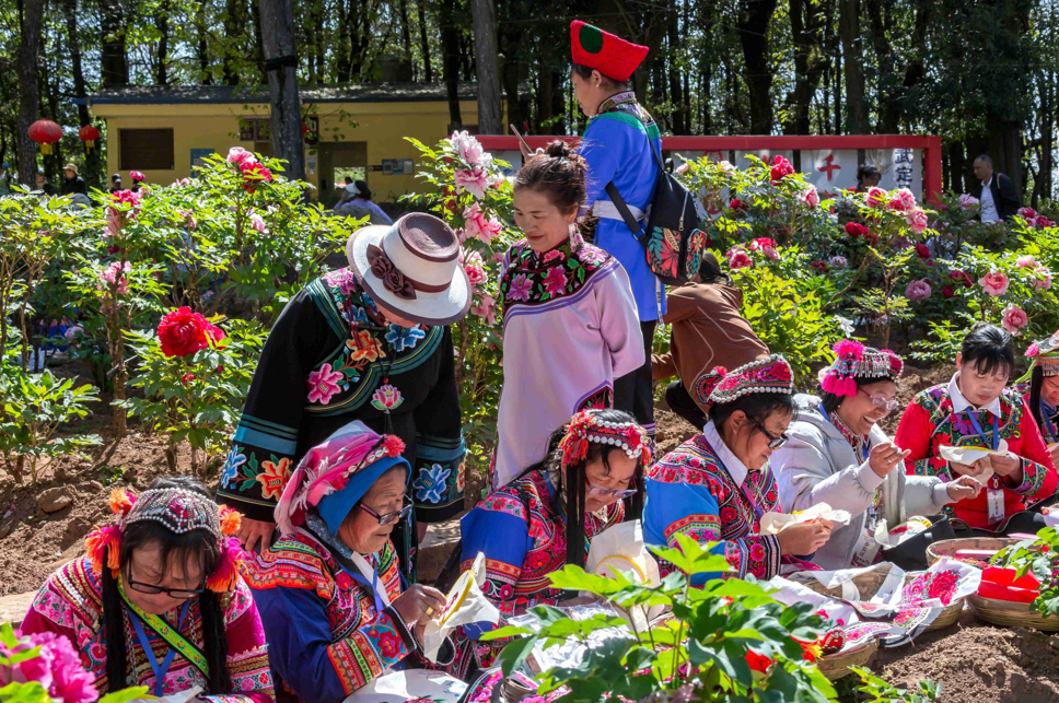 武定县2026年牡丹文化旅游季,绣娘们在牡丹花丛里用彝绣技法绣牡丹。武学成 摄