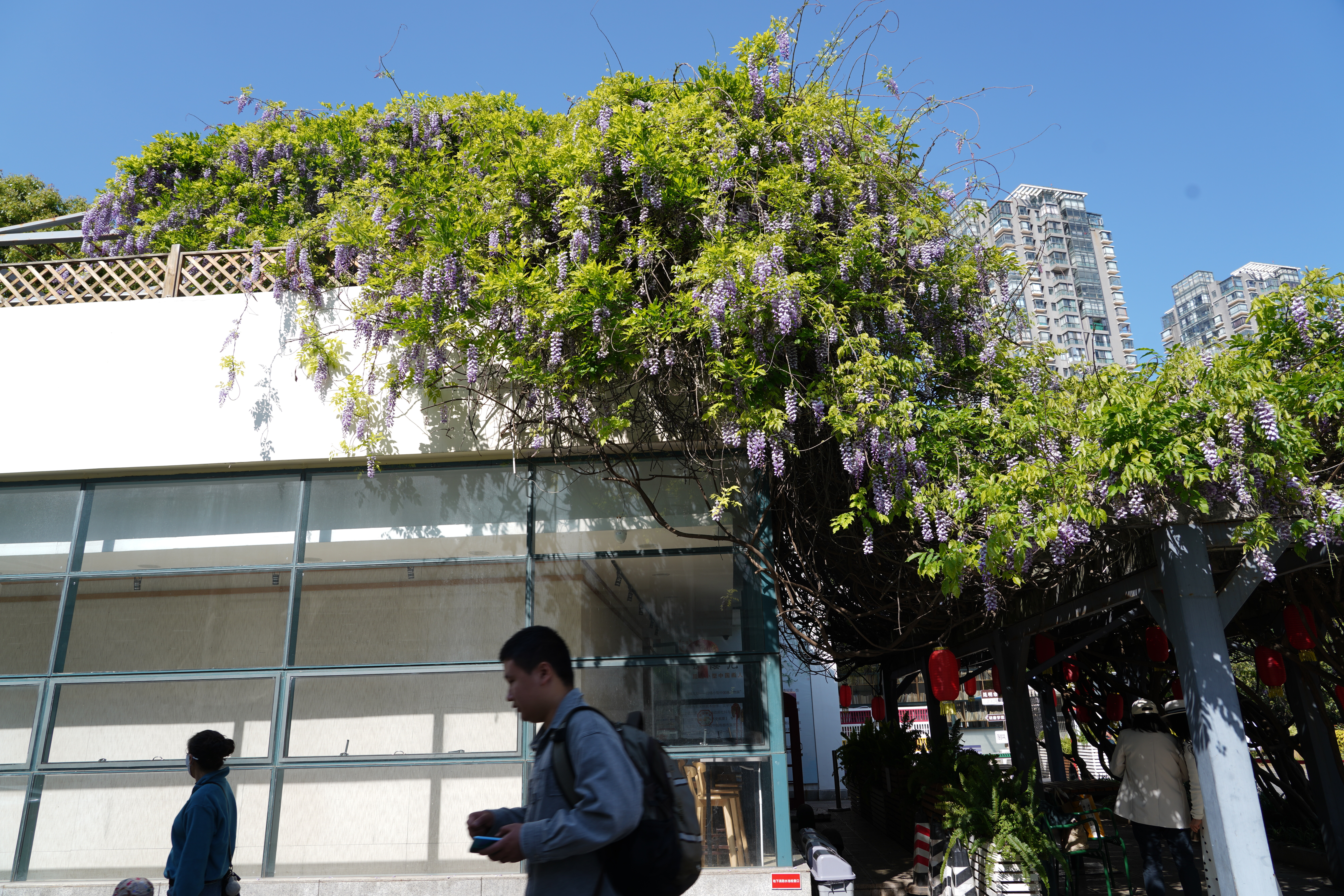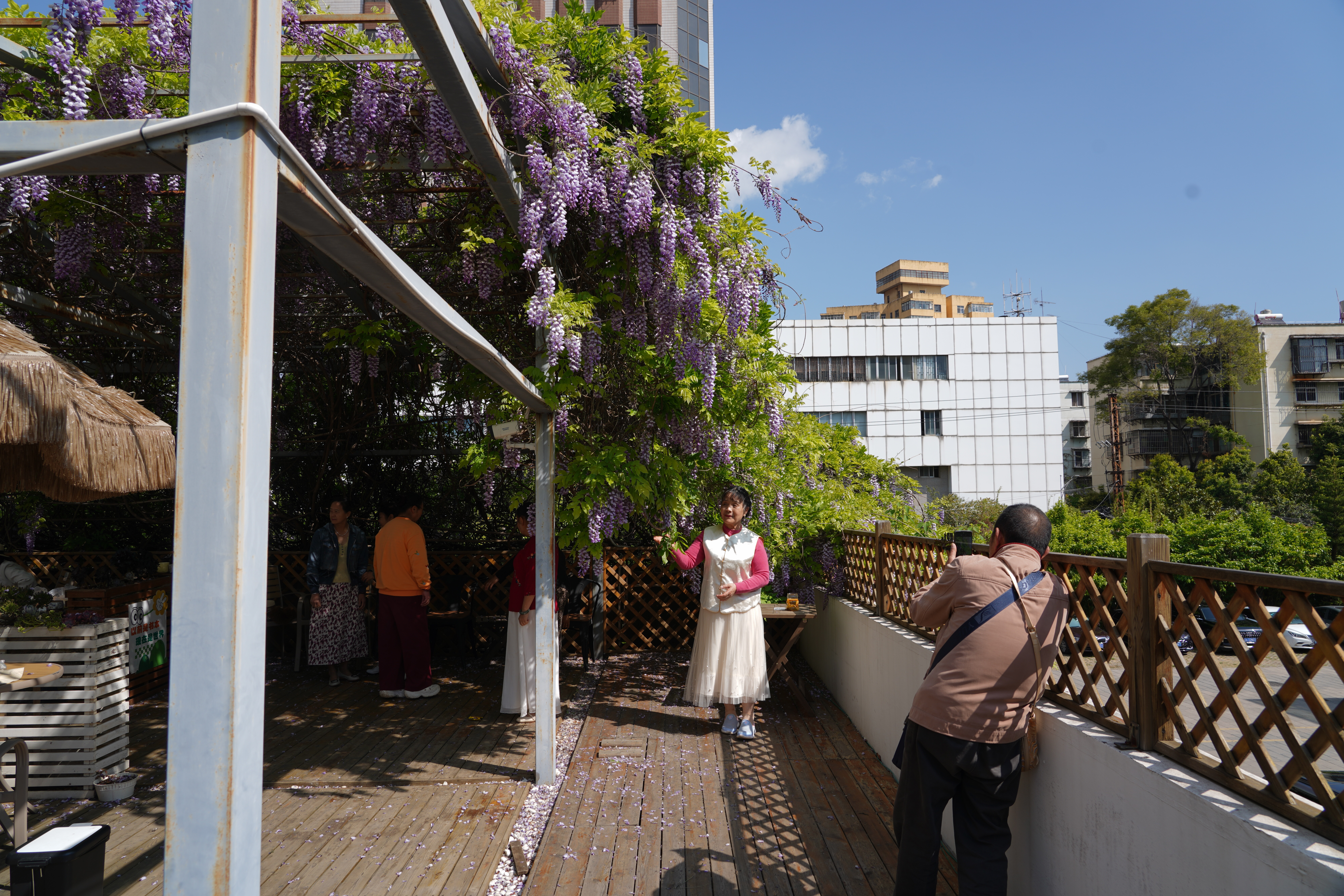 “这种浪漫或许只有在云南才有吧。”现场一位游客感叹道。昆明的气候四季如春,紫藤花在这里开得格外繁盛,而将自然花景与人文阅读空间相结合,更显出一种独有的生活美学。