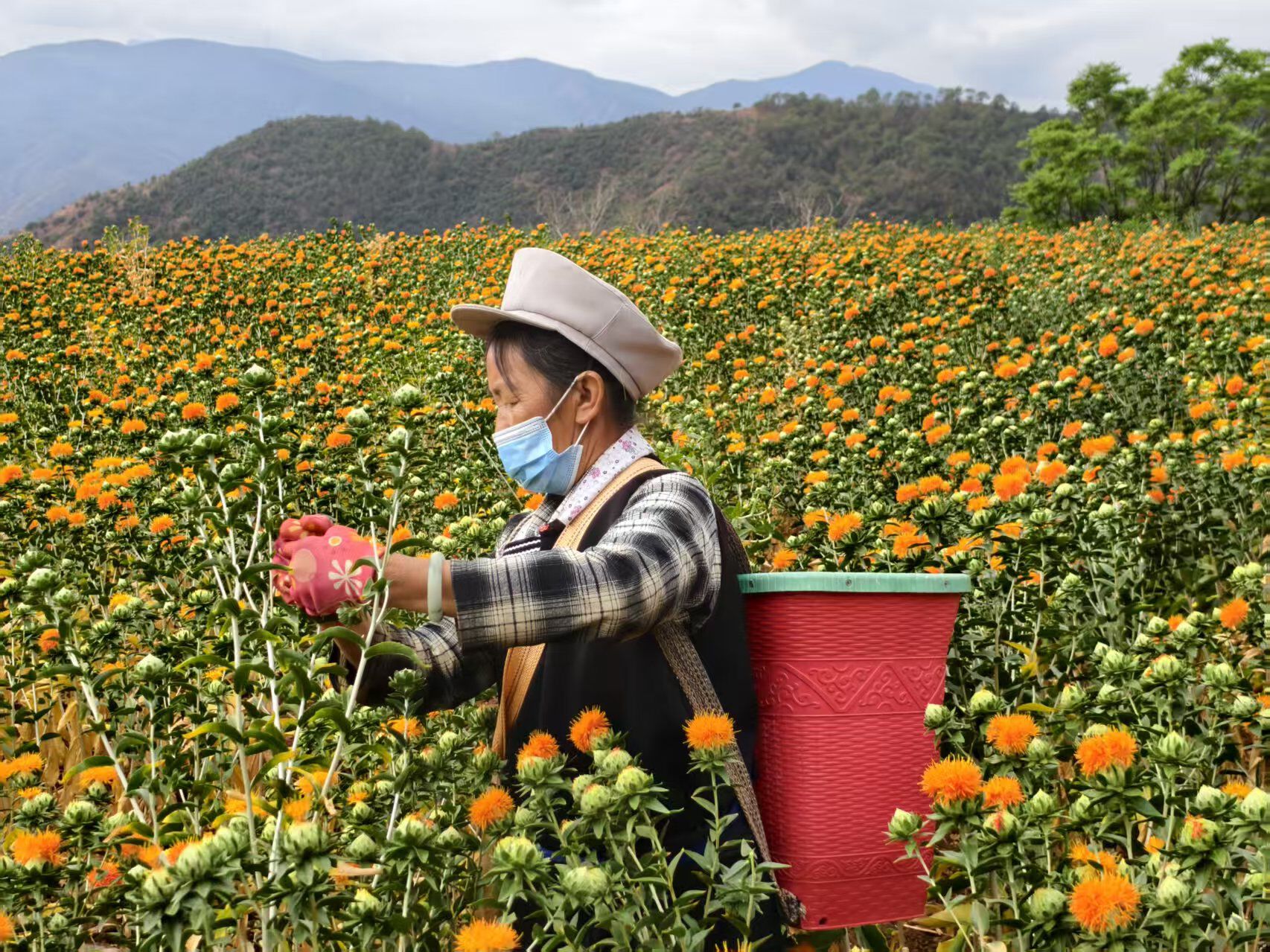 近日,大理白族自治州鹤庆县六合乡麦地村红花迎来丰收季,田间枝头红艳满枝,丰收图景十分喜人。这抹亮眼的红色,不仅是乡野间的亮丽风景,更是当地群众增收致富的坚实底气。