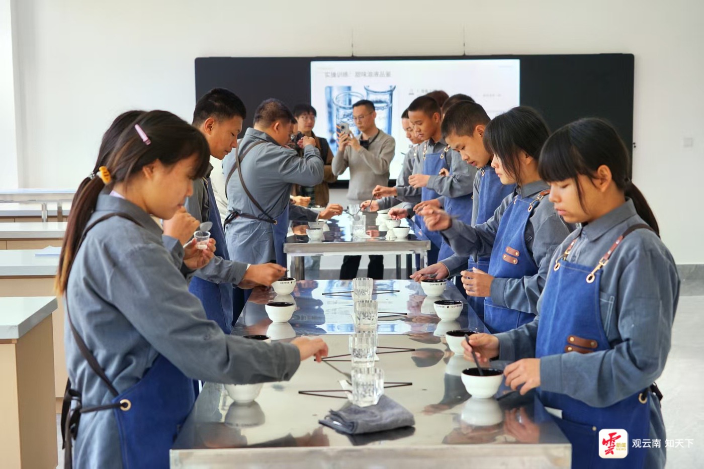 在实训场地,采访团实地观摩咖啡豆筛选、烘焙、手工冲煮、品质杯测、模拟开店、直播销售,以及咖啡产品量产等全程紧贴产业一线的实操课程。据介绍,学院依托市公共实训基地,建成6000余平方米教学实训场地,投资千万元打造专业咖啡实训工厂,配备国内外先进生产设备,设有大师室、杯测室、拉花教室等多个功能区,单次可容纳500人同步实训,打通课堂与车间的壁垒。