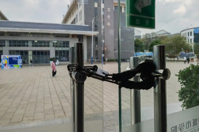 昆明城市学院下午4:30后上锁的教学楼与暂停服务的图书馆。新华社记者 岳冉冉 摄