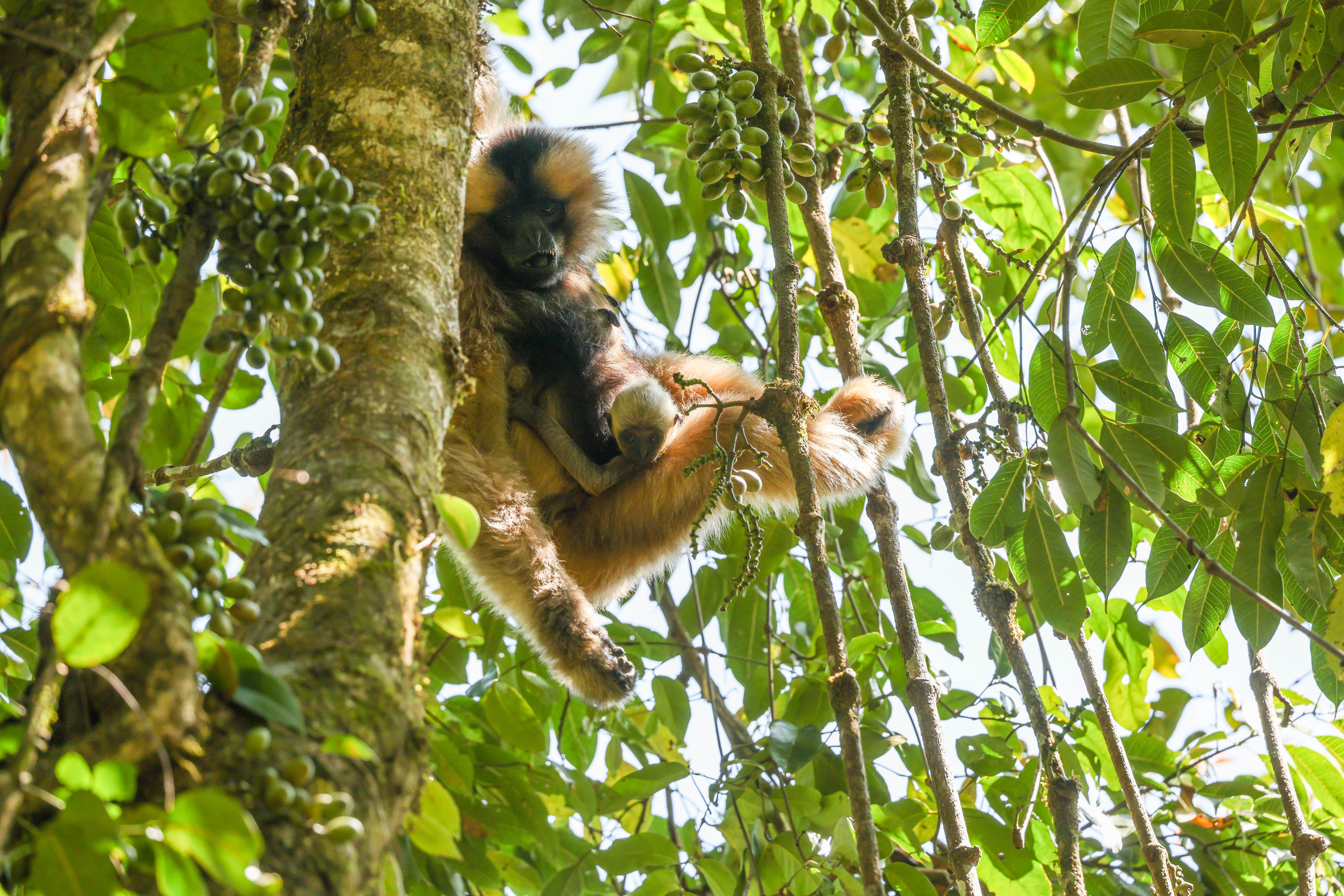 近日,工作人员在云南无量山国家级自然保护区景东大寨子区域巡护监测时,发现一只雌性西黑冠长臂猿怀里多了一只刚出生的猿宝宝。