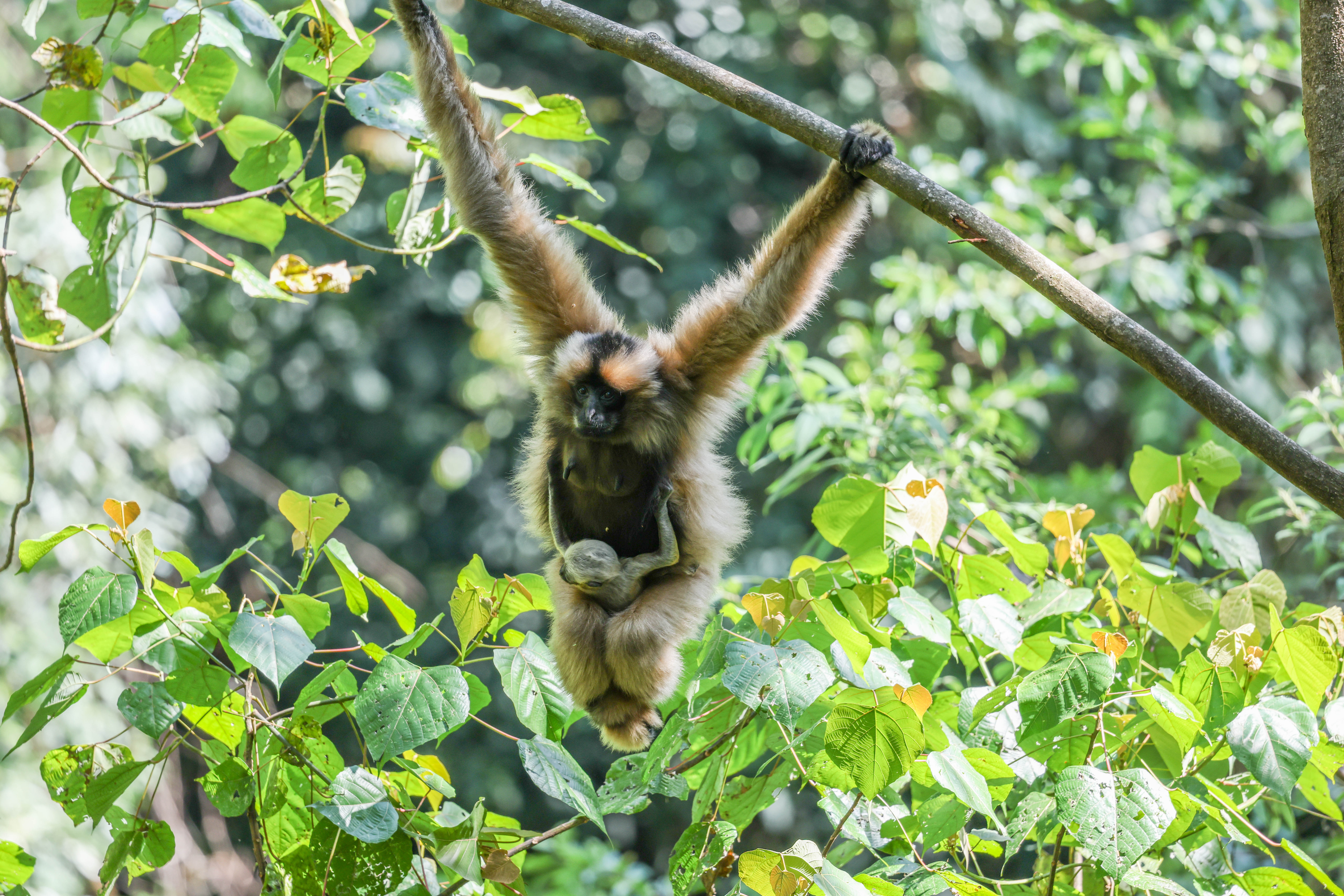连日来,工作人员持续跟踪监测,记录下了珍贵画面。监测资料显示,长臂猿妈妈在树冠间灵活移动,采食嫩叶、花果,一只乳白色的猿宝宝被稳稳抱在怀中,不时吮吸乳汁。在附近,猿爸爸和群体中另一成员静静守护。饱餐后的猿宝宝时常探出脑袋,睁大眼睛好奇地观察周围环境,母子状态均十分良好。