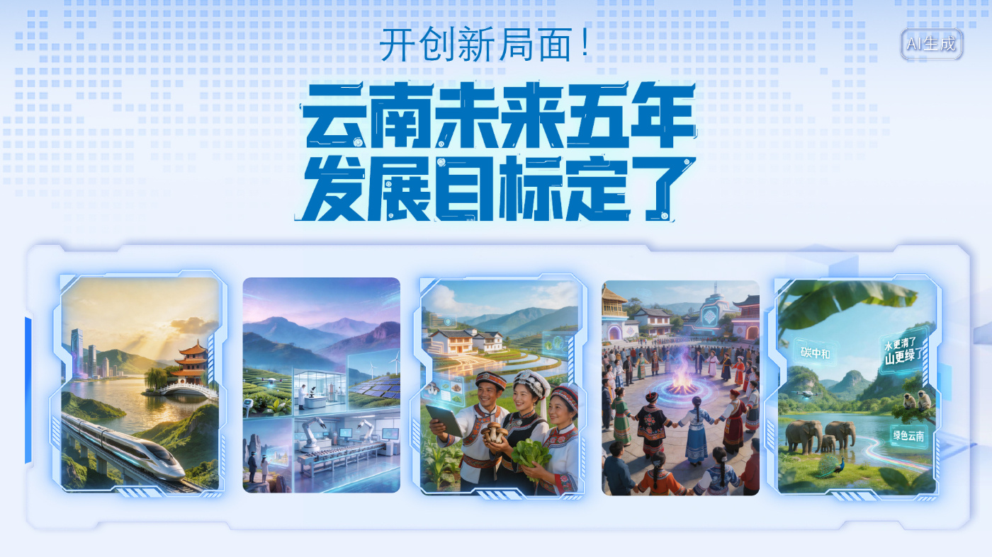 今天,由云新闻客户端制作推出的AI系列海报《开创新局面!云南未来五年发展目标定了》继续带您抢先预览云南未来五年的高光时刻,感受新质生产力在云岭大地的脉动。