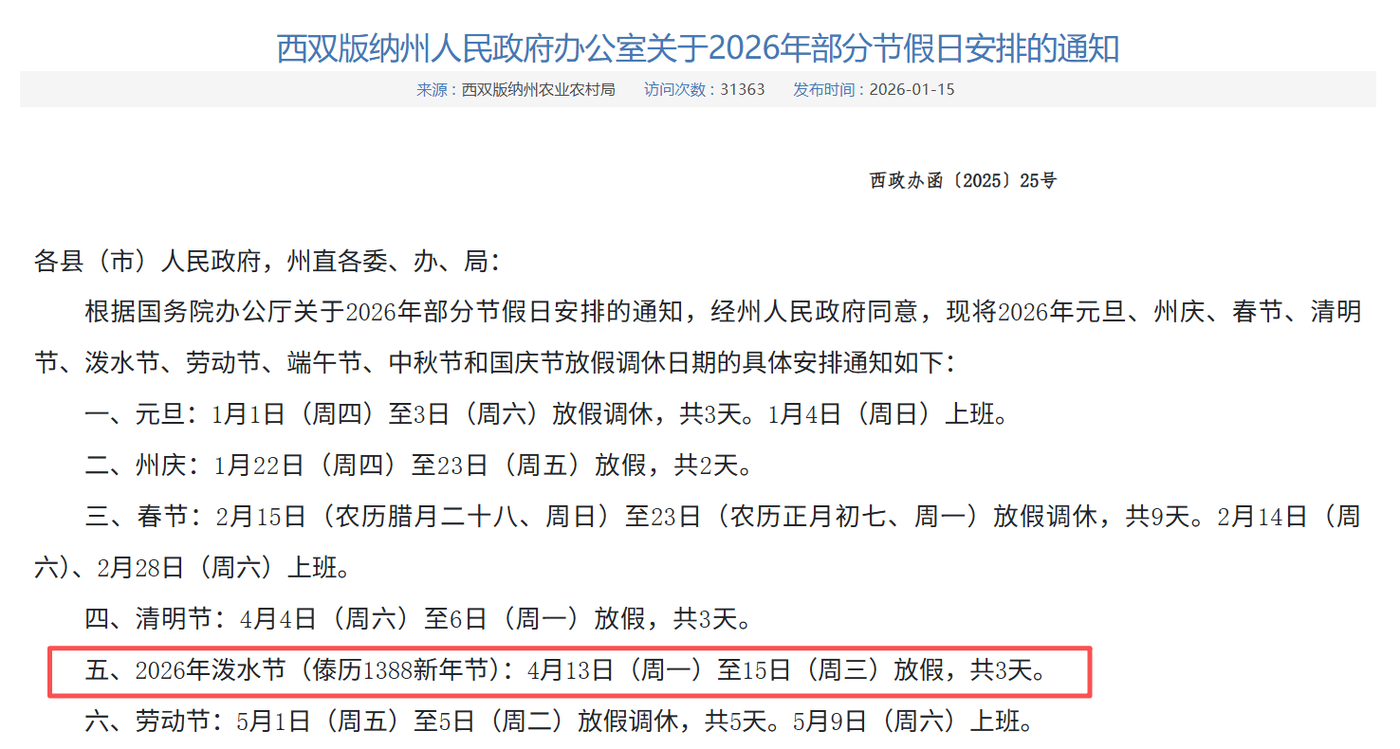 根据《西双版纳州人民政府办公室关于2026年部分节假日安排的通知》,2026年泼水节(傣历1388新年节):4月13日(周一)至15日(周三)放假,共3天。