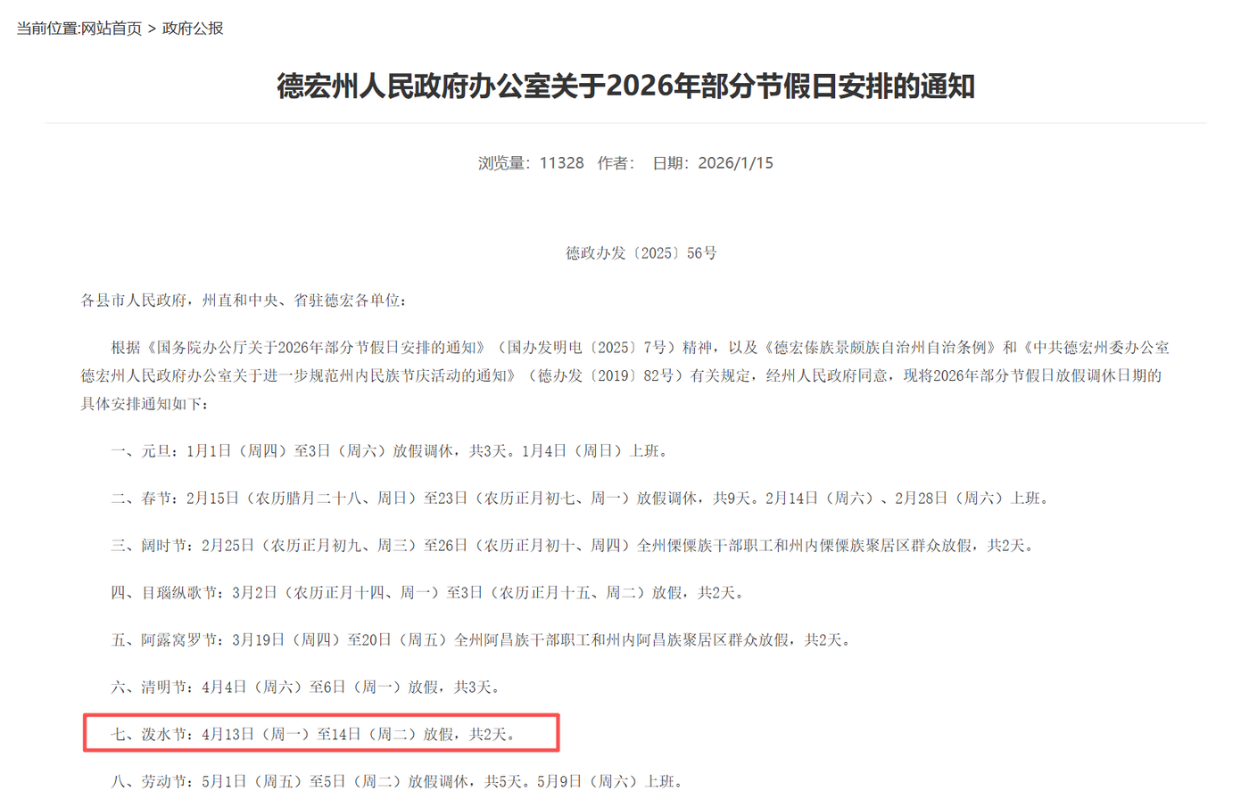 根据《德宏州人民政府办公室关于2026年部分节假日安排的通知》,泼水节:4月13日(周一)至14日(周二)放假,共2天。