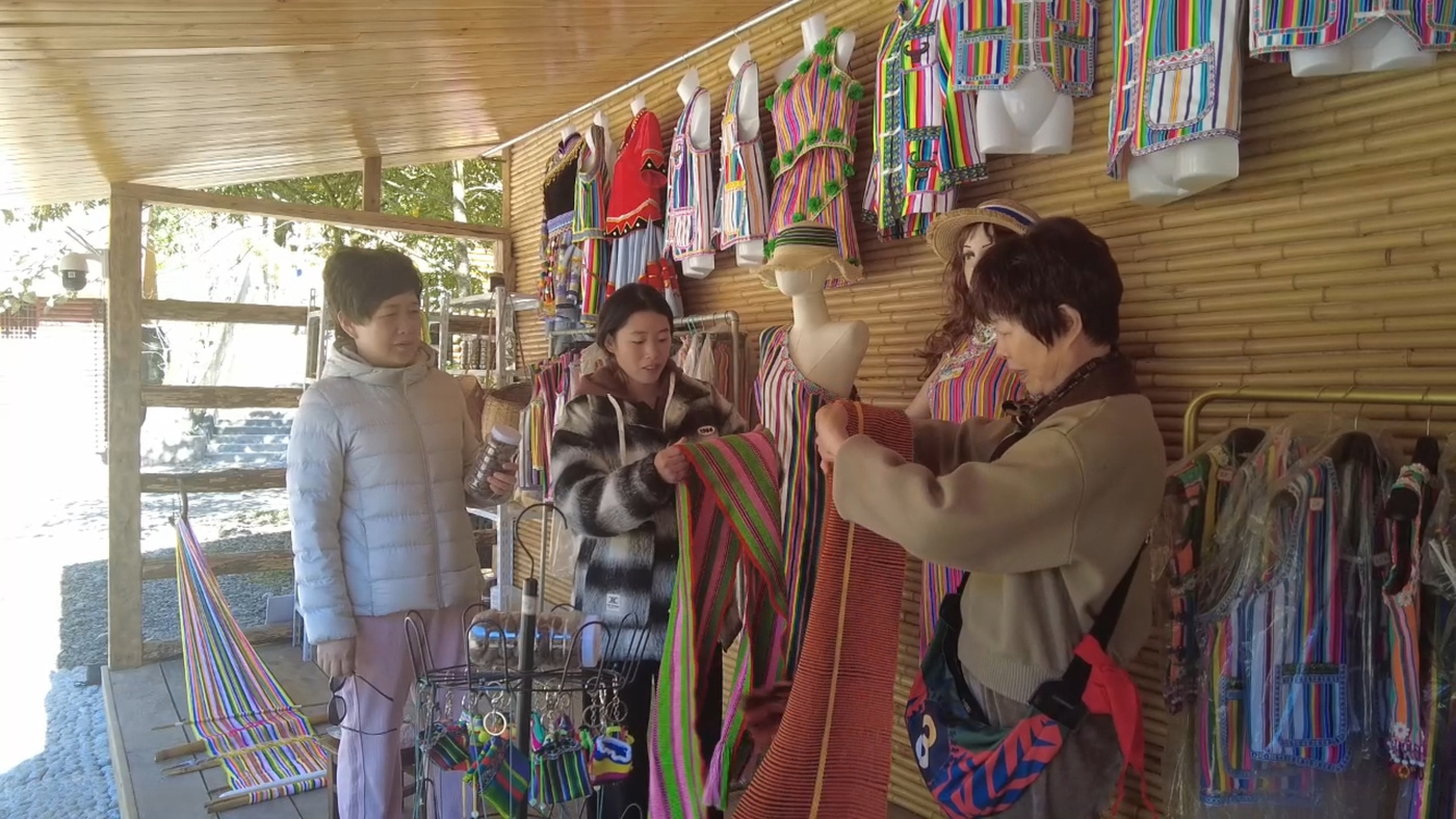 刚开始,做了几件传统服装,但发现这些服装并不是很吸引游客。于是开始做一些创新,把自己织的独龙毯裁成围巾,来搭配平时的穿着,把外婆教的花样印在帆布包上,还学着编了耳环、手链……为了符合现代人的审美,我还把独龙毯的颜色进行调整,尽可能显得简单大气,适应当下的流行趋势。这样一调整,喜欢的游客就变多了。别看这个店小,淡季一天能卖两百元,旺季能卖到七八百元呢。