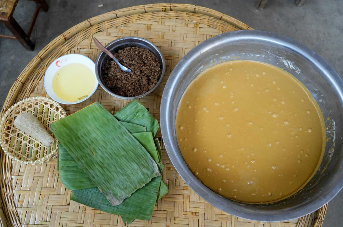 糯米粉、食用植物油、新鲜芭蕉叶、红糖水与苏子