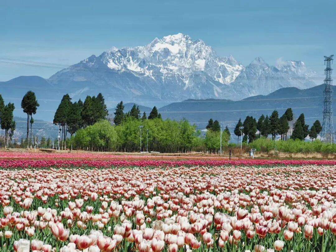 走进位于古城区开南街道的四季花开景区,成片郁金香肆意盛放,远处皑皑白雪的玉龙雪山在蓝天下静静伫立,圣洁的雪峰与脚下绚烂的花海相映成趣。
