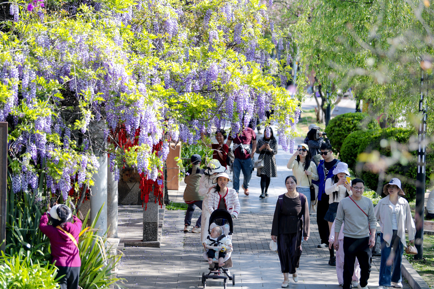 昆明大观公园内,紫藤长廊、近华浦及庾园一带,累累花穗垂挂藤架,如瀑布倾泻,又如揉碎的紫霞轻落枝头。