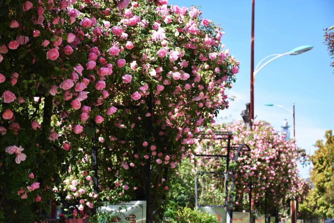 近日,丽江古城区玉福路中段百株蔷薇迎来盛花期,成为市民感受春光的好去处。