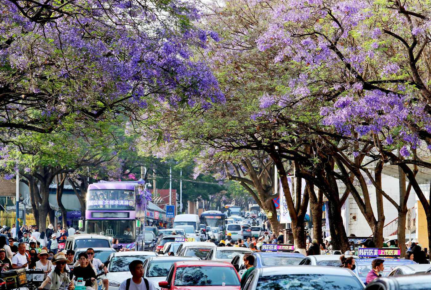 教场中路蓝花楹初放,整条街区人潮涌动、车水马龙。记者 杨峥 摄