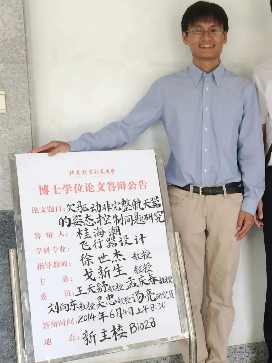桂海潮用毛笔写的答辩公告。图源:北京航空航天大学微信公众号