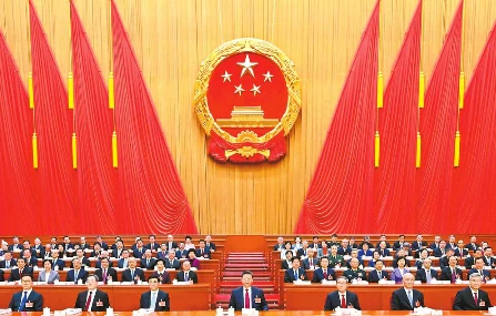 人民大会堂万人大礼堂气氛庄重热烈,主席台帷幕正中的国徽在鲜艳的红旗映衬下熠熠生辉。