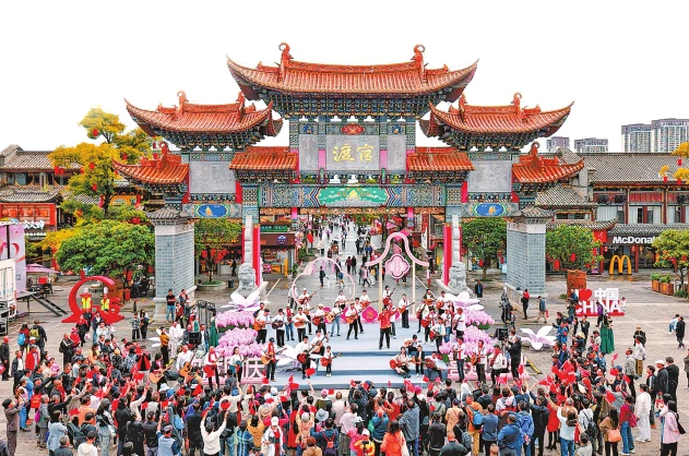 10月1日,昆明官渡古镇举办百人吉他快闪活动,唱响红色经典歌曲。 记者 胡妤雅 摄