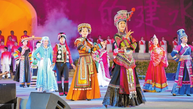 夜幕降临,古朴厚重的朝阳楼在霓虹映衬下尽显风华。随着激昂深情的《我的祖国》旋律响起,活动拉开序幕。6个走秀片段依次呈现,华服化作文明的载体,诉说不忘文化根源的初心,衣袂流转间展现山川市井文明生机。在“家园共筑·建水一家亲”主题演出中,《千年紫陶》《遇见建水》等歌曲轮番上演,以旋律展现建水的美食、美景与民俗文化。灯火映照下,游客与市民歌舞同欢,共唱幸福。