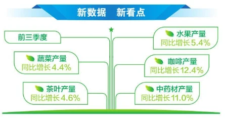 今年前三季度,全省蔬菜产量2338.75万吨、同比增长4.4%,水果产量1188.38万吨、同比增长5.4%,茶叶产量53.97万吨、同比增长4.6%,咖啡产量4.50万吨、同比增长12.4%,中药材产量61.10万吨、同比增长11.0%。