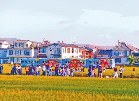金秋十月,大理喜洲稻浪翻涌,“喜洲号”“有风号”小火车满载游客在稻田间穿行,形成独特的风景线,吸引了众多游客。近年来,喜洲镇通过“稻田+铁路”场景再造,将田园景观转化为可沉浸式体验的移动剧场,带动周边稻田咖啡、稻田旅拍等业态蓬勃发展,这片苍山脚下的稻田成为大理文旅的热门IP。(记者 黄兴能 摄)
