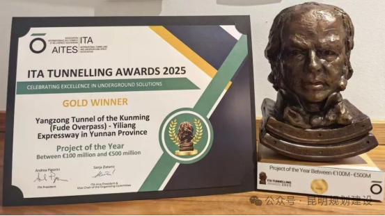 近日,2025年第十一届国际隧道与地下空间协会大奖颁奖典礼在塞尔维亚贝尔格莱德举行,由中国铁建昆仑集团投资建设、中铁第四规划设计研究院设计、中铁十九局集团有限公司承建的云南省昆明(福德立交)—宜良高速公路阳宗隧道荣获年度隧道工程奖(€1亿–5亿元类别)金奖。