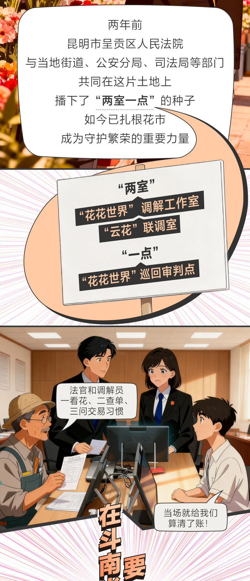 两年前,昆明市呈贡区人民法院联合街道、公安分局、司法局等有关部门,在此播下“两室一点”的种子,如今已深深扎根,枝繁叶茂,成为化解矛盾,守护花市繁荣发展的重要力量。