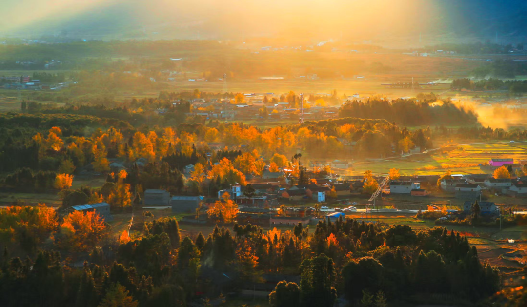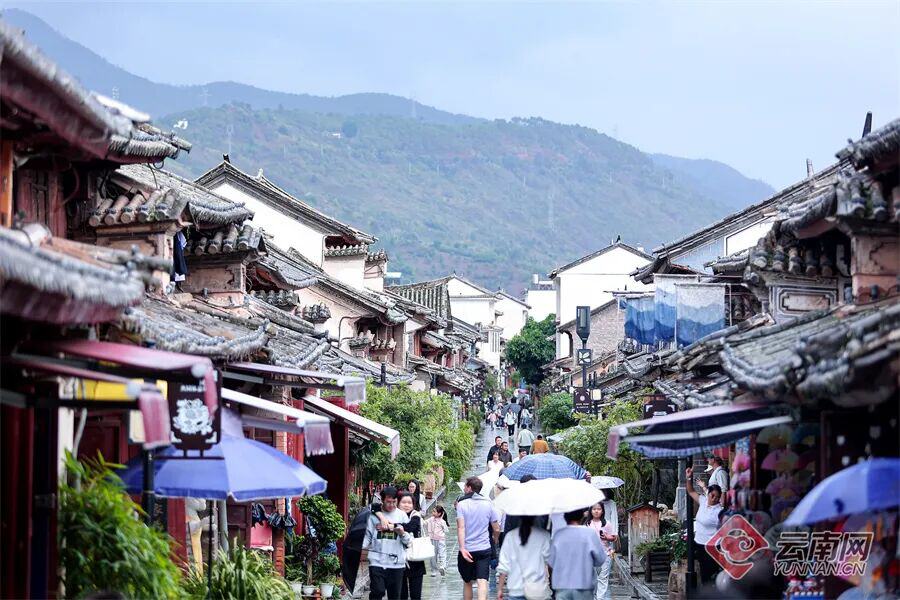 巍山古城雨景,青石板路与古建筑交相辉映。