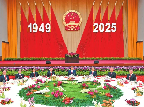 人民大会堂宴会厅华灯璀璨,洋溢着喜庆热烈的节日氛围。主席台上方高悬着庄严的国徽,“1949—2025”大字年号在鲜艳红旗映衬下格外醒目。