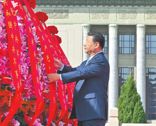 习近平迈步上前,仔细整理花篮缎带。随后,习近平等党和国家领导人缓步绕行,瞻仰人民英雄纪念碑。