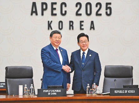 当地时间11月1日上午,国家主席习近平出席亚太经合组织第三十二次领导人非正式会议东道主交接环节,宣布中方将于明年11月在广东省深圳市举办亚太经合组织第三十三次领导人非正式会议。这是习近平同韩国总统李在明在交接环节上握手。新华社记者 谢环驰 摄